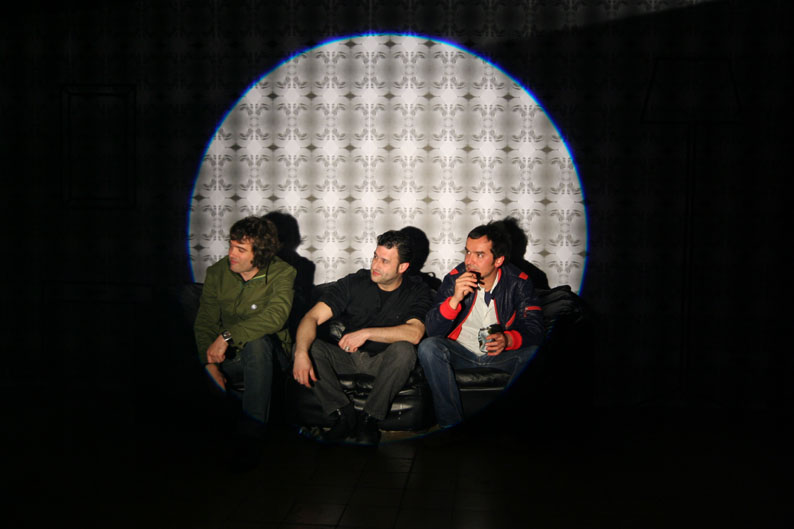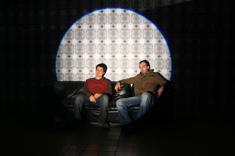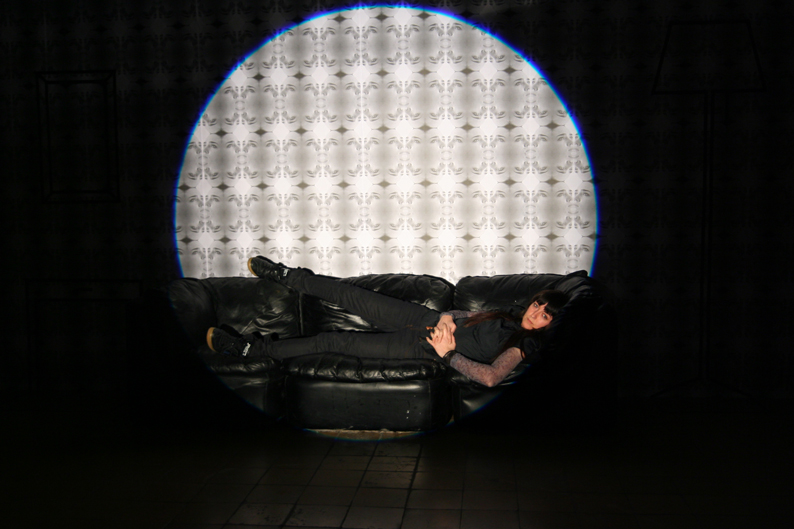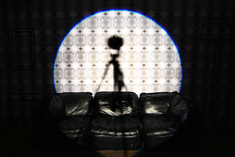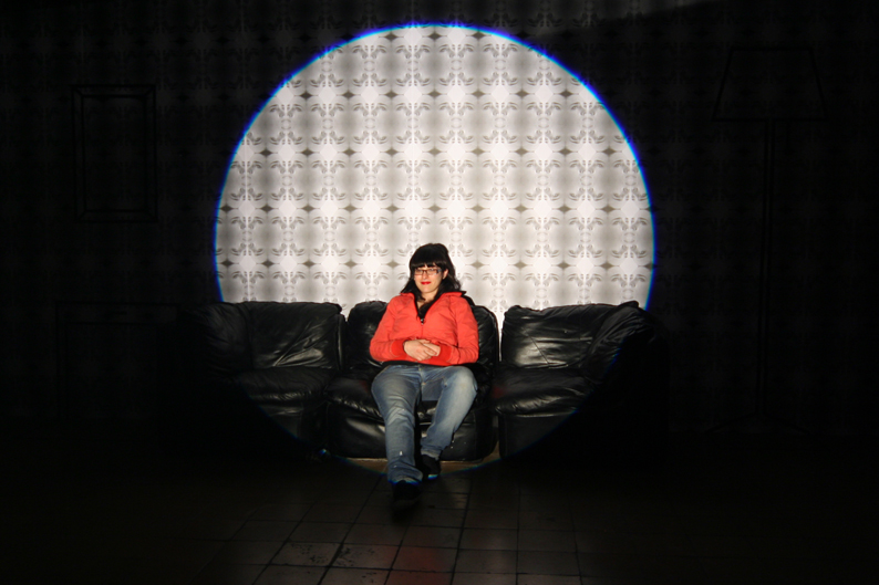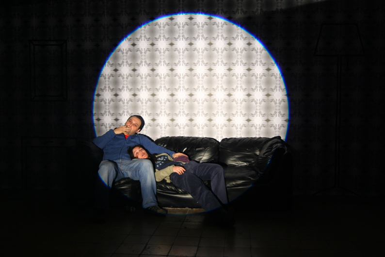 Se diseña un papel de pared con una imagen televisiva del retrato de una mujer. La imagen está tomada directamente de la pantalla dando así esa textura y saturación de color tan característica de la televisión. Otros elementos son el dibujo diédrico con cinta adhesiva del mobiliario de la sala de un hogar, un sofá real y un foco teatral enfocando la escena. Después se realizaron fotografías al público asistente induciéndoles a ponerse como si estuvieran en su casa y el foco fuera la pantalla televisiva. El foco de 1000 Watios y cuando se inocrporan de nuevo no ven nada mas que la huella de la luz en la retina. Las fotografías resulatntes son de 60x40 sobre papel Lambda de alta calidad mate y marco negro.