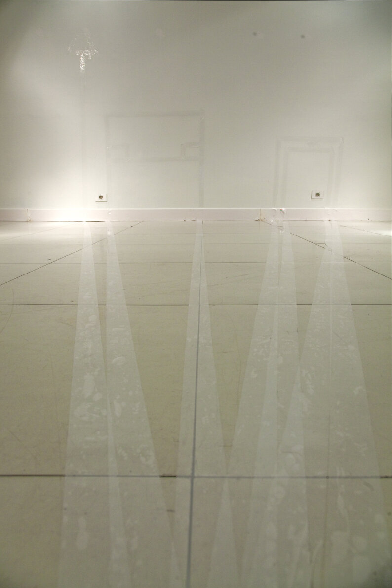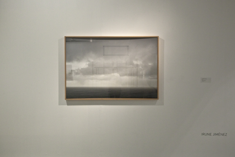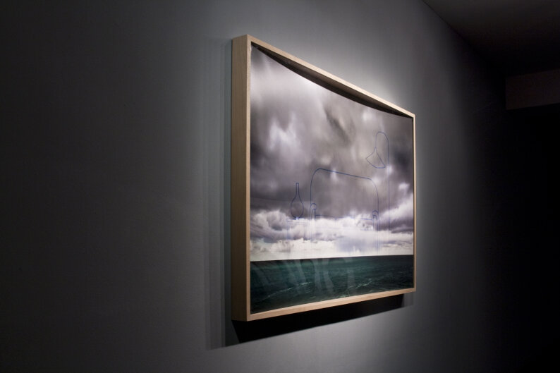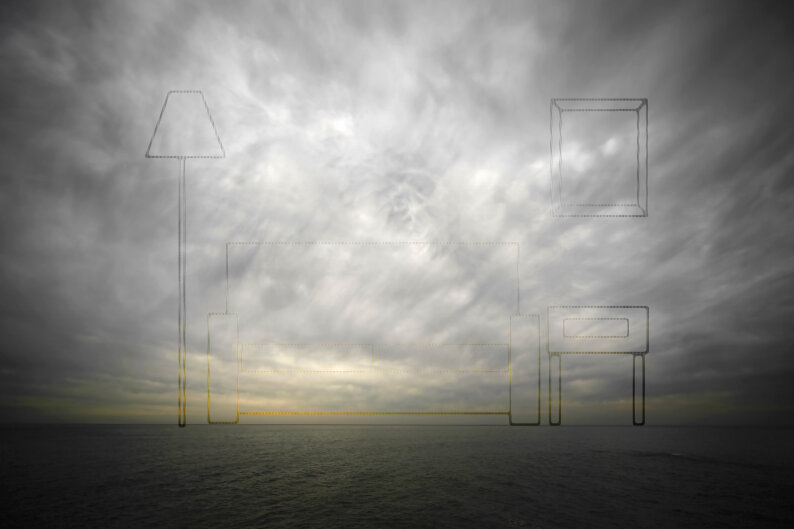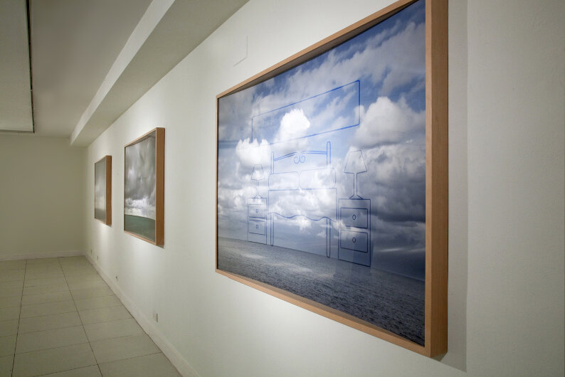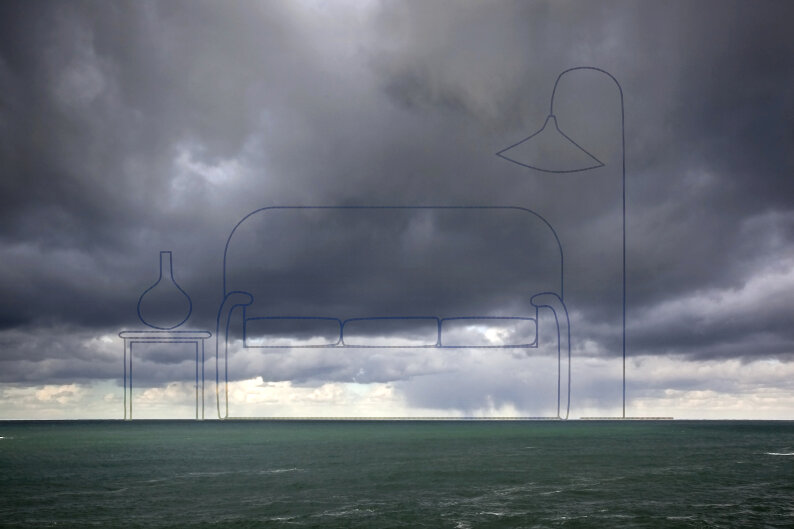 This work of 2011 links two different realities, the one we see in the real world and the one we see through the screen. We understand the things that are around us through these two realities, and both are part of our life experience, whose limits or frontiers are diffuse. All this is made with the union of two different representations; one is taken from a real scene of a sea horizon and the other is the Picture of that image taken from a TV screen. The pictures taken directly from the TV screen has a very particular texture and colour which is overlayed on the other and is cut with the silhouette drawing of house furnitures.
