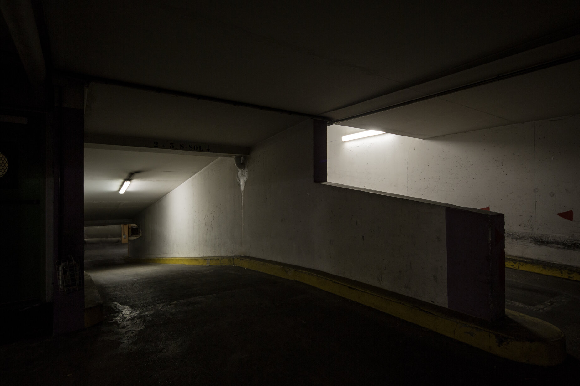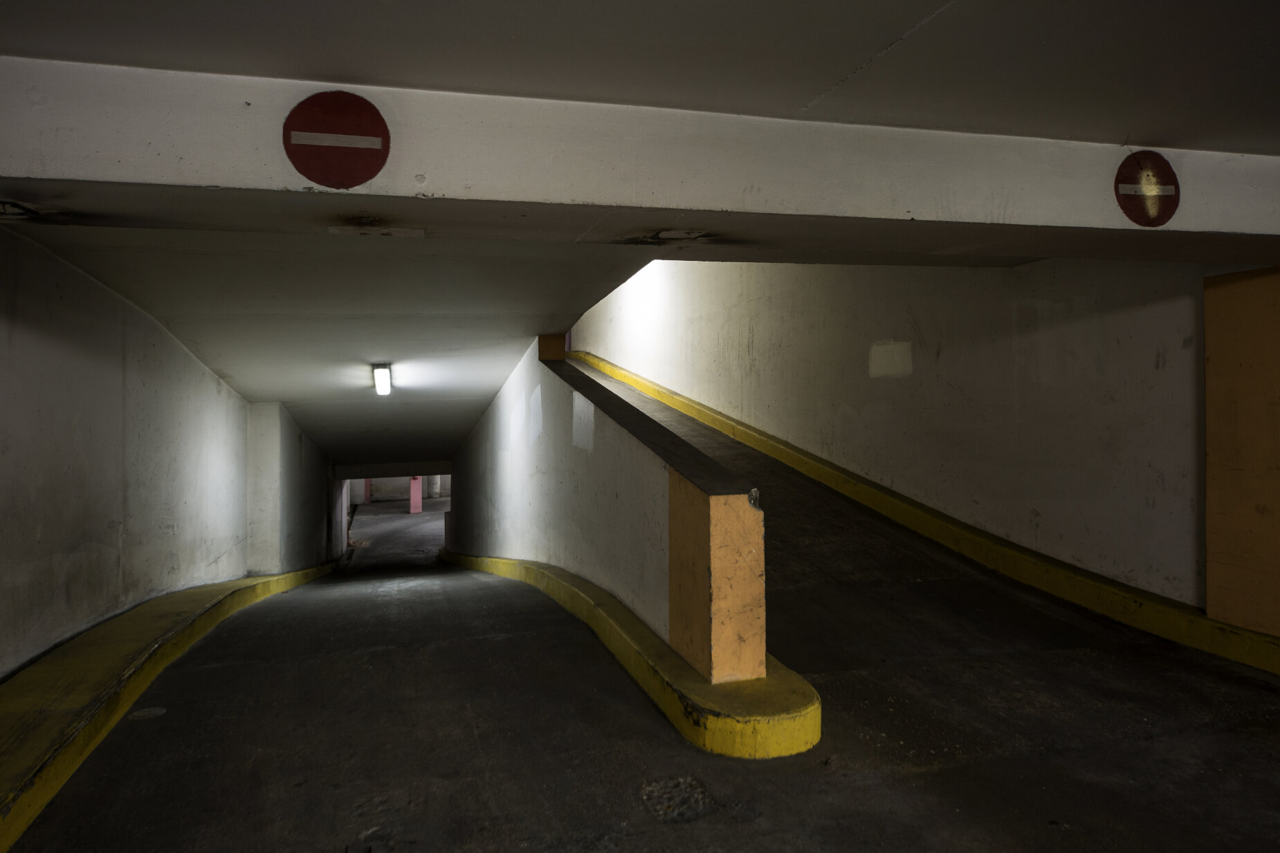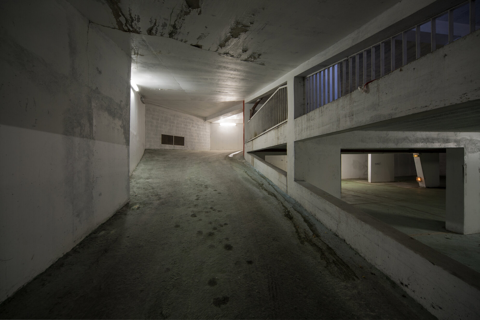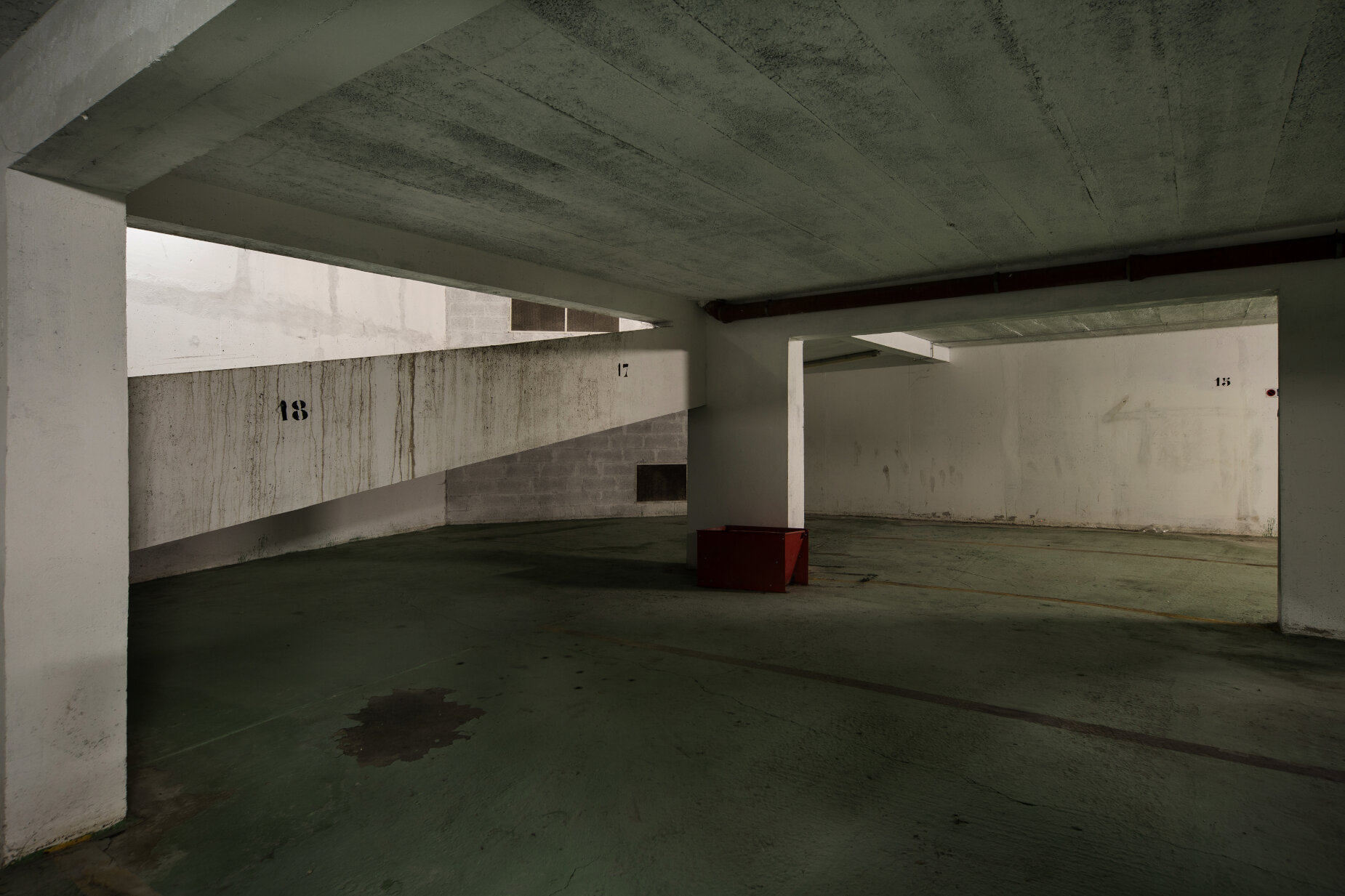 Cette série de photographie se focalise sur des lignes architecturales, pures et nues où tout a une fonctionnalité . De froides lumières, dont l'unique finalité est d'allumer les ténèbres, dessinent des formes sur les murs. Le vide noir des endroits sombres où la lumière n'est pas fondamentale crée dans certains cas des paysages troublants. L'architecture ici est remarquable de par sa praticité sans chair et dépourvue de parures ou d'éléments superflus. Tous dessins et symboles y ont une signification concrète et utile; la sortie, le numéro de place, l’étage. Les ornementations sont hors de propos dans ces non-lieux. Les ressources sont économisées jusqu'à l'expression minimale, tout est simplifié; les matériaux, les espaces, les interstices, les couloirs, les escaliers. Même les artistes du graffiti n'osent pas décorer les garages pour leur donner une touche humaine.