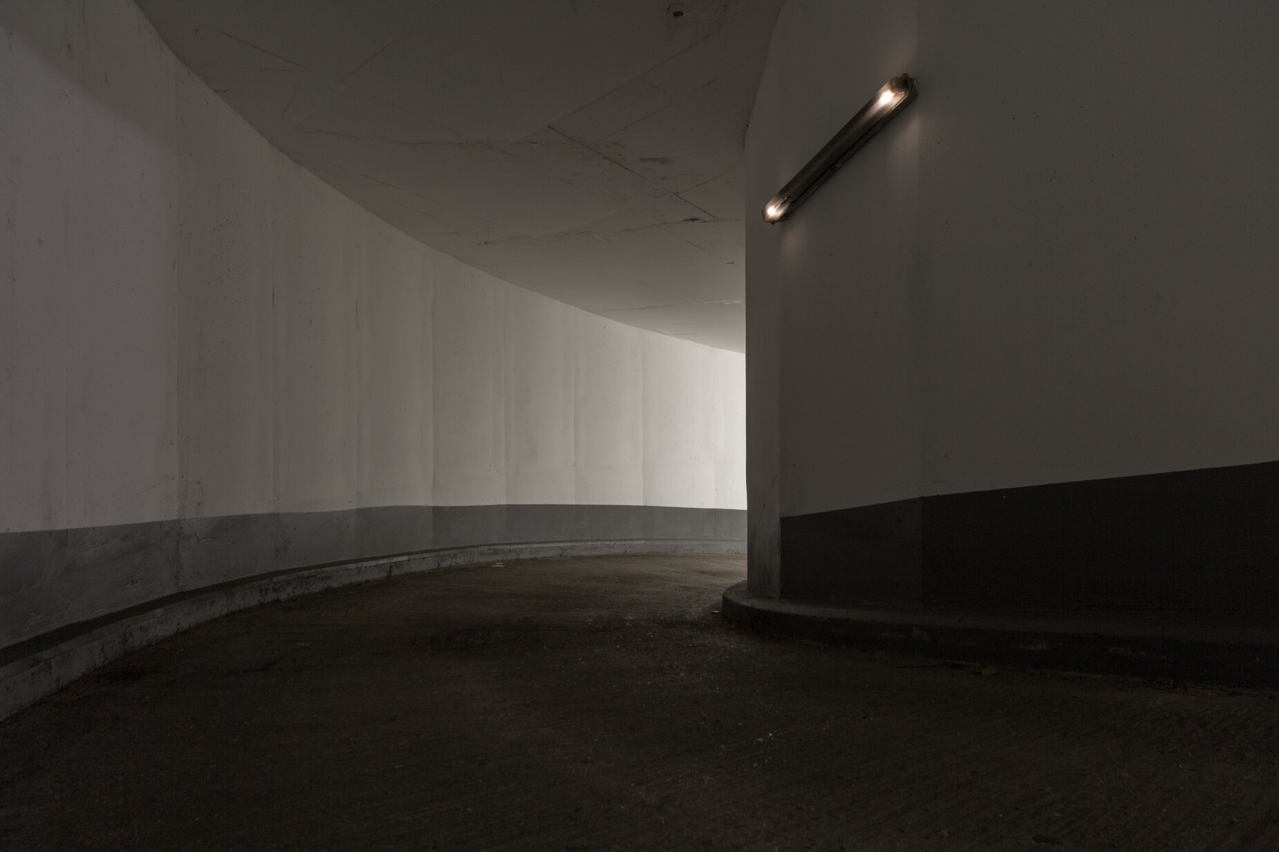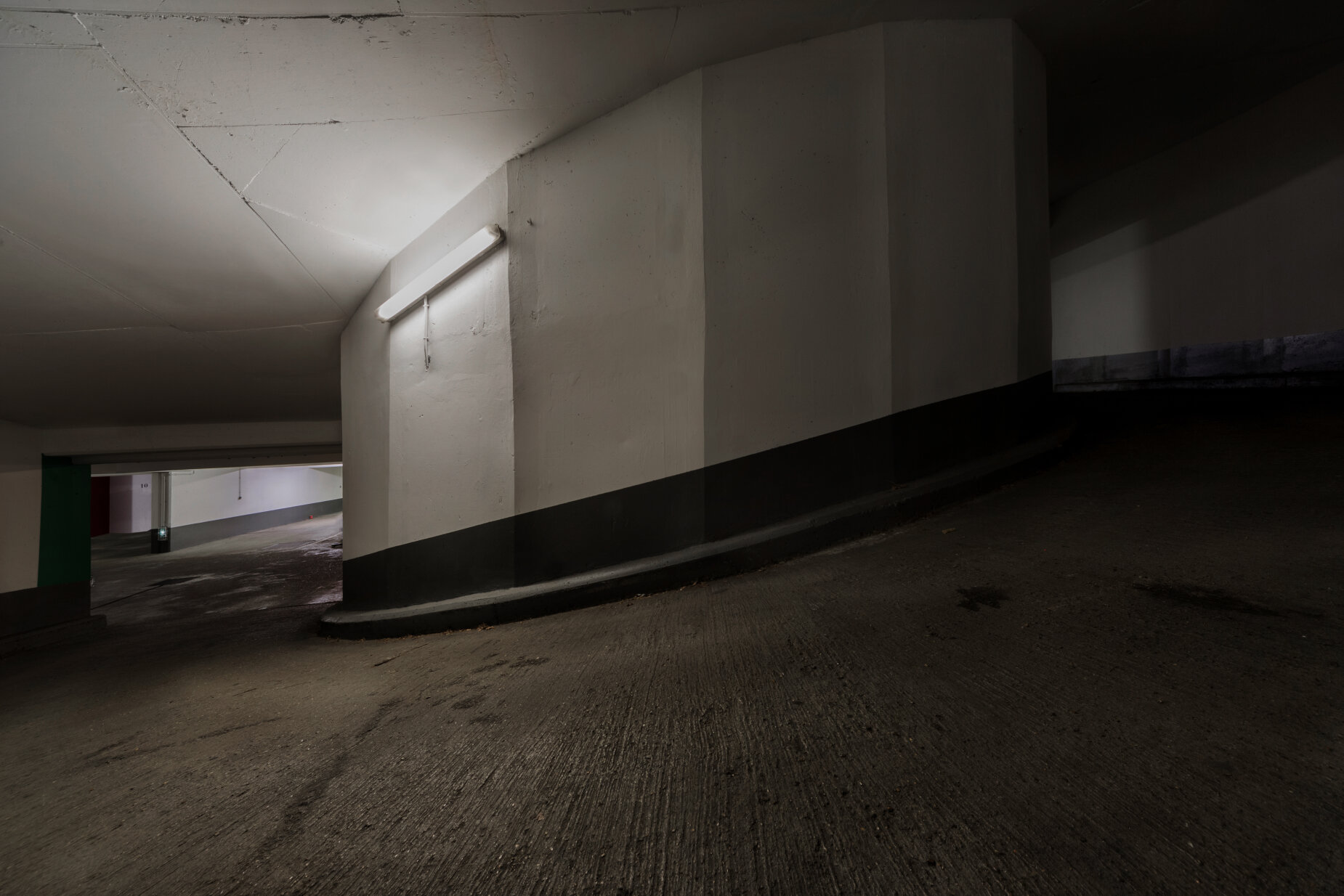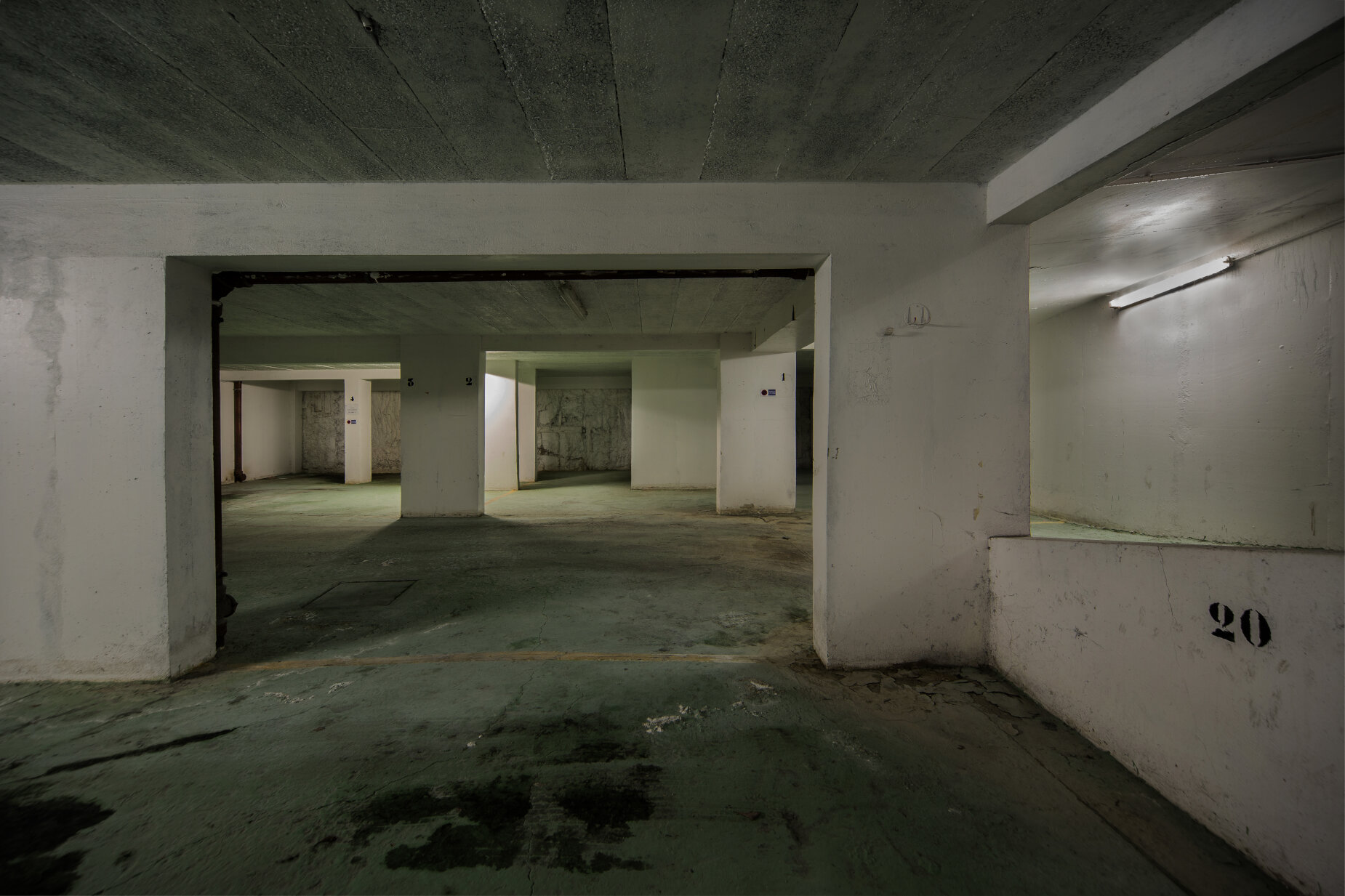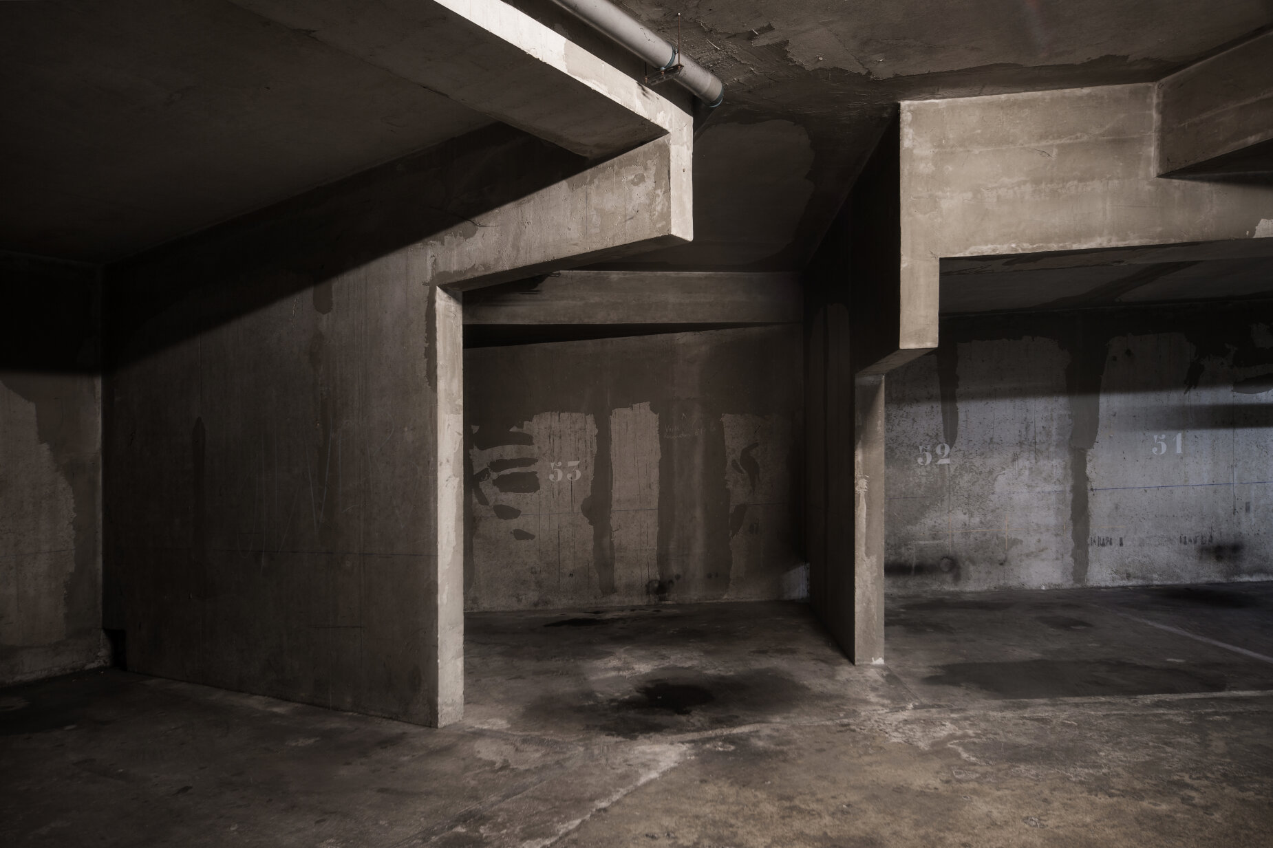 Cette série de photographie se focalise sur des lignes architecturales, pures et nues où tout a une fonctionnalité . De froides lumières, dont l'unique finalité est d'allumer les ténèbres, dessinent des formes sur les murs. Le vide noir des endroits sombres où la lumière n'est pas fondamentale crée dans certains cas des paysages troublants. L'architecture ici est remarquable de par sa praticité sans chair et dépourvue de parures ou d'éléments superflus. Tous dessins et symboles y ont une signification concrète et utile; la sortie, le numéro de place, l’étage. Les ornementations sont hors de propos dans ces non-lieux. Les ressources sont économisées jusqu'à l'expression minimale, tout est simplifié; les matériaux, les espaces, les interstices, les couloirs, les escaliers. Même les artistes du graffiti n'osent pas décorer les garages pour leur donner une touche humaine.